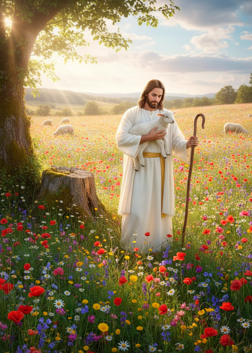 Diamond painting Jezus en lam in bloemenveld | Exclusief bij Painting Diamonds©
